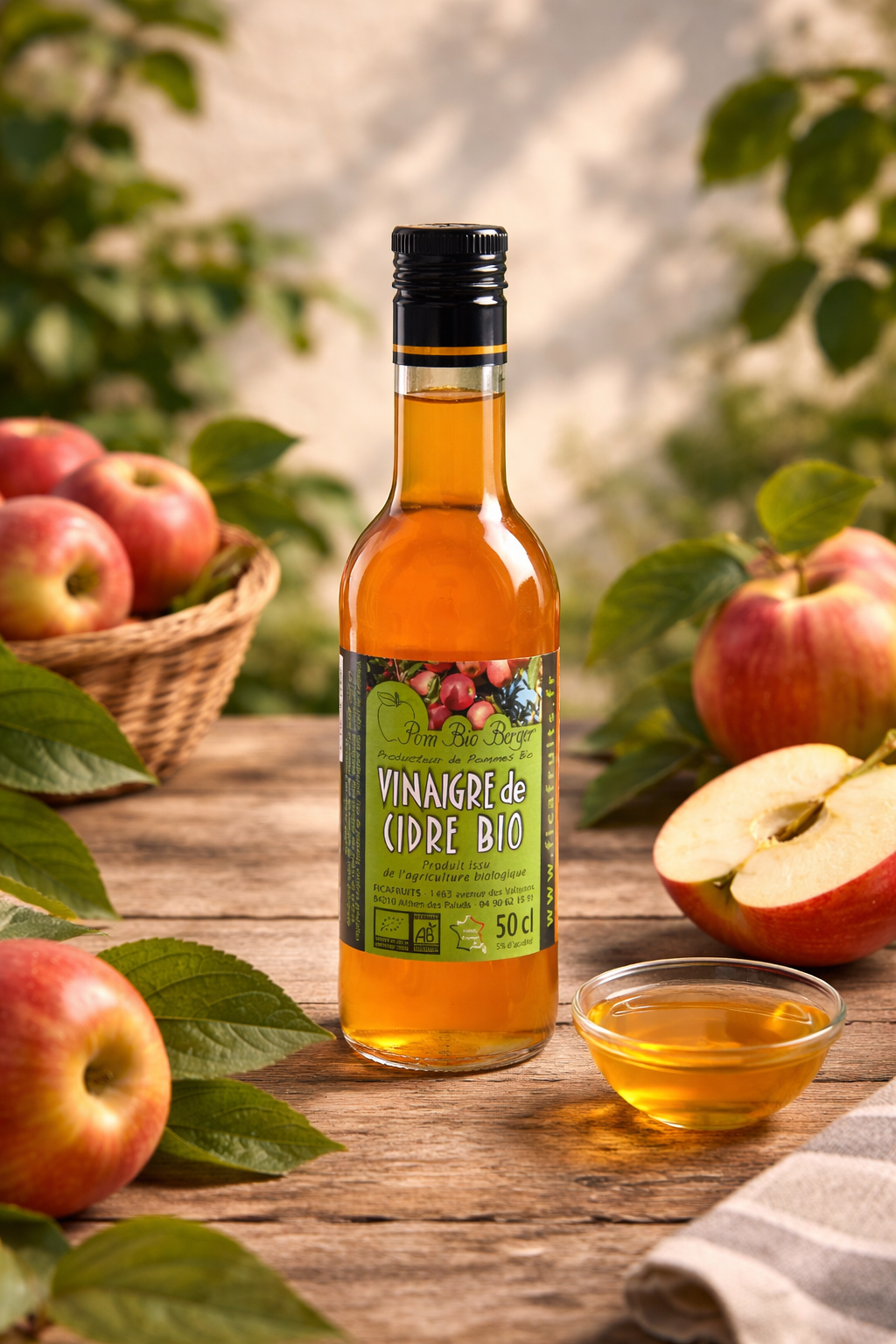 Vinaigre de cidre, non pasteurisé, issu de pommes produites en agriculture biologique. Peut contenir des traces de sulfites. Un léger dépôt est normal pour un vinaigre de cidre biologique et n’altère en rien sa qualité.